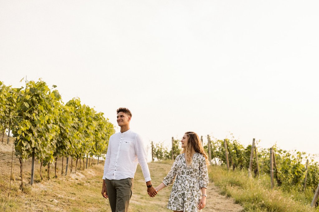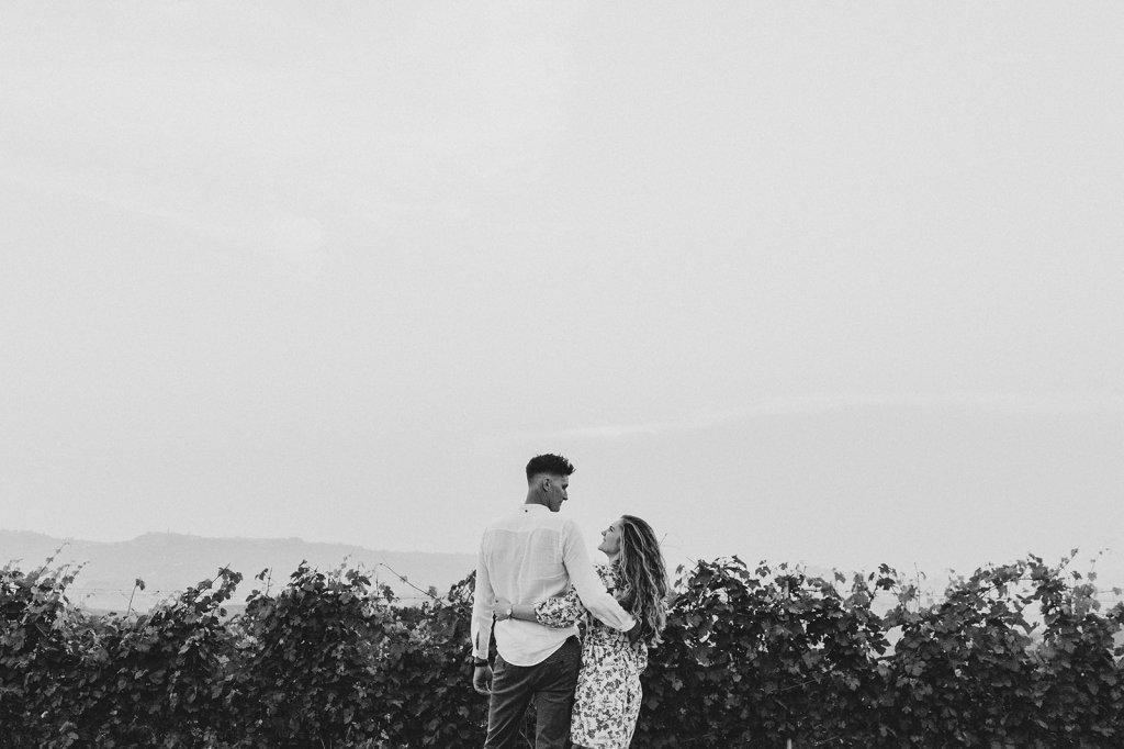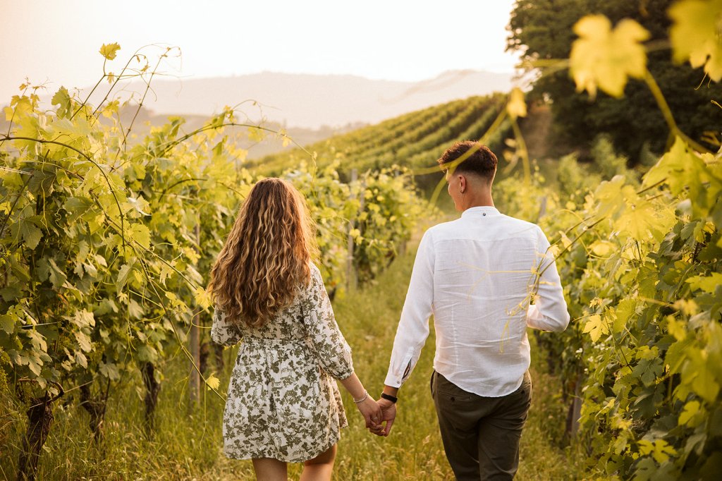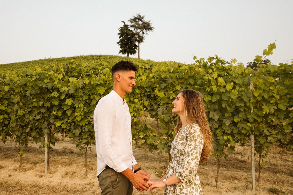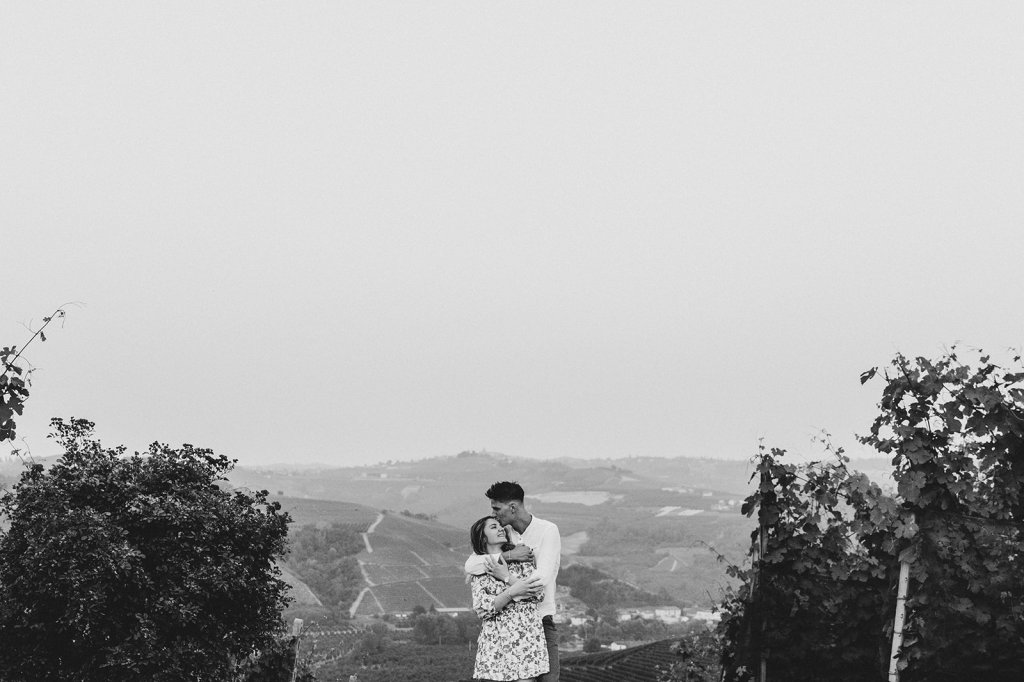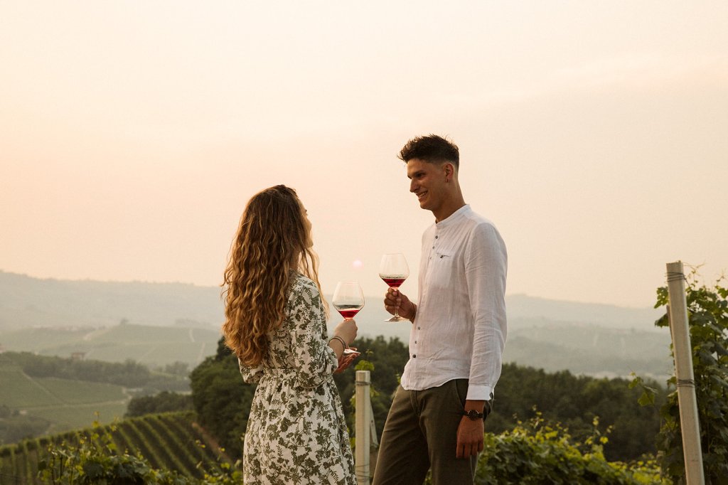La sessione si è chiusa con un tramonto che da qui sa essere così intenso. Ammirarlo da questo punto delle Langhe è sempre emozionante, ma con Anna e Riccardo davanti all’obiettivo ha assunto un valore diverso: un orizzonte che sembra aprirsi sul loro futuro.